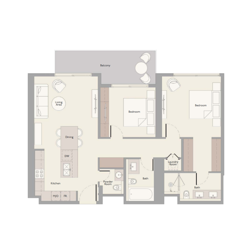The bedroom: crafted using wood look tile floors and high-quality natural materials. The space is also rich with a delicate and neutral color palette, while the full-length wardrobes provide ample hanging, drawer, and shelf spaces. The living room: the open-concept elements and the sleek floor tiles and walls add a modern flair to the space and enhance the overall room in an aesthetically organized way.